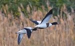 今季のツクシガモの初記録は4羽でした。お写真はO氏です。左は翼後縁に白線のある幼鳥、右は翼後縁の黒い成鳥ですね。