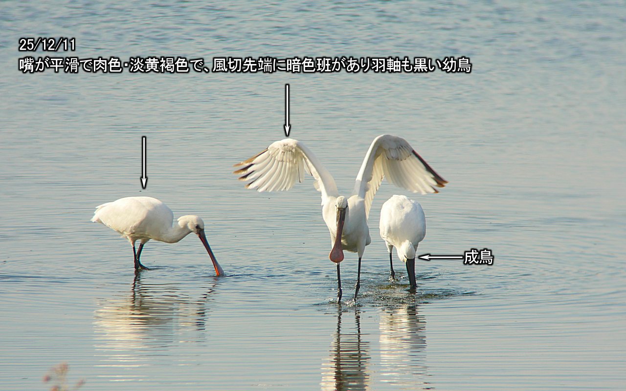 12月に入って、ヘラサギは午前中に成鳥1羽と幼鳥2羽のグループが南池にいることが多くなってきた。採餌しているのが観察できる。