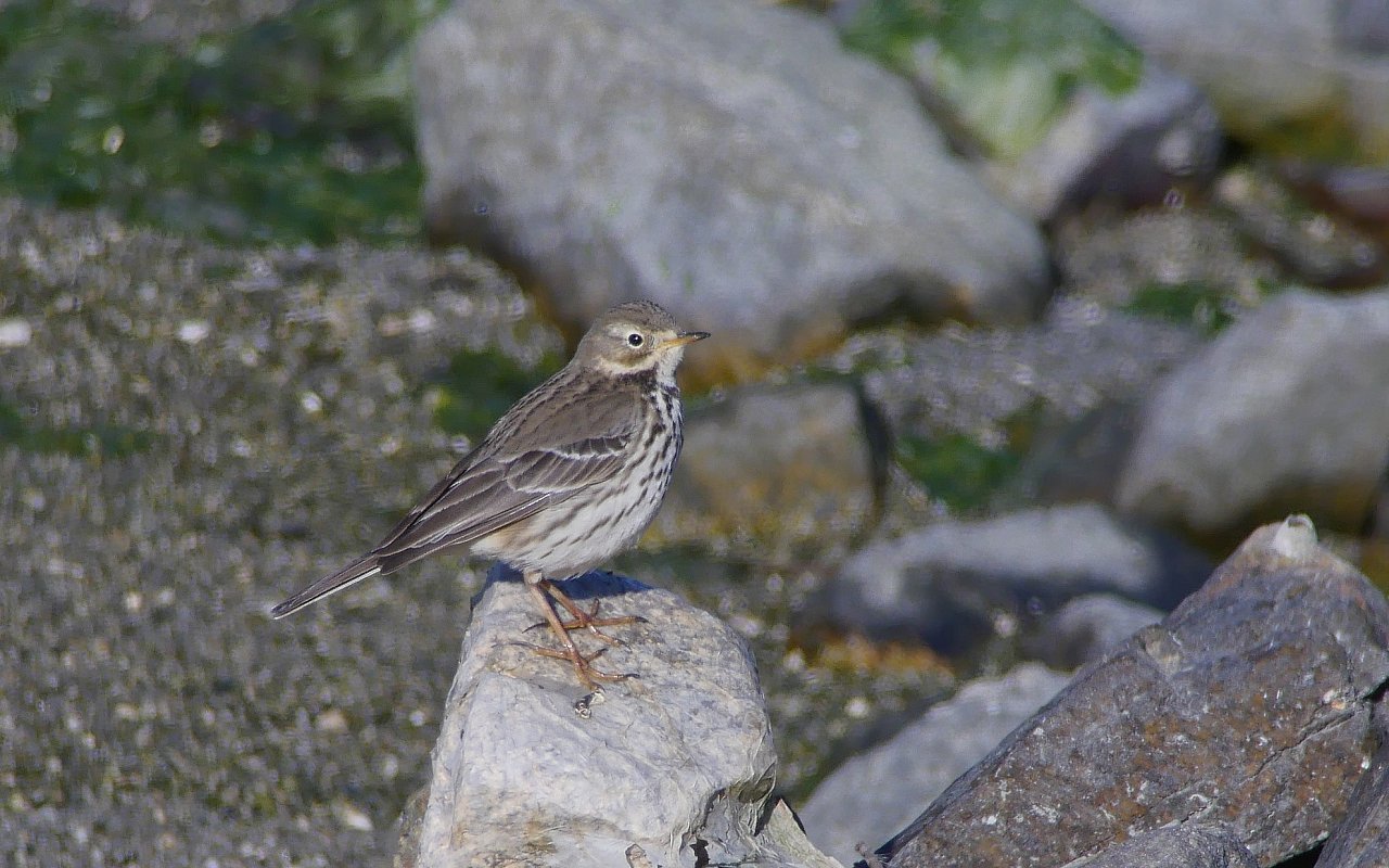 展望塔前の石積みのお立ち台にタヒバリが・・・。この時期ビンズイもいるのですが、タヒバリは褐色でビンズイのようなオリーブ褐色味はありません。