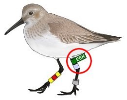 アラスカ州のハマシギ標識については、2010年冬にデータロガーを右足上部に付けて観察され、データロガーを回収の後、再標識・放鳥。2012年春に大阪南港野鳥園で再度、観察されたEEK個体(通称)を例として、イラストを左に揚げてみた。(観察された記事・画像はこちらへ)
