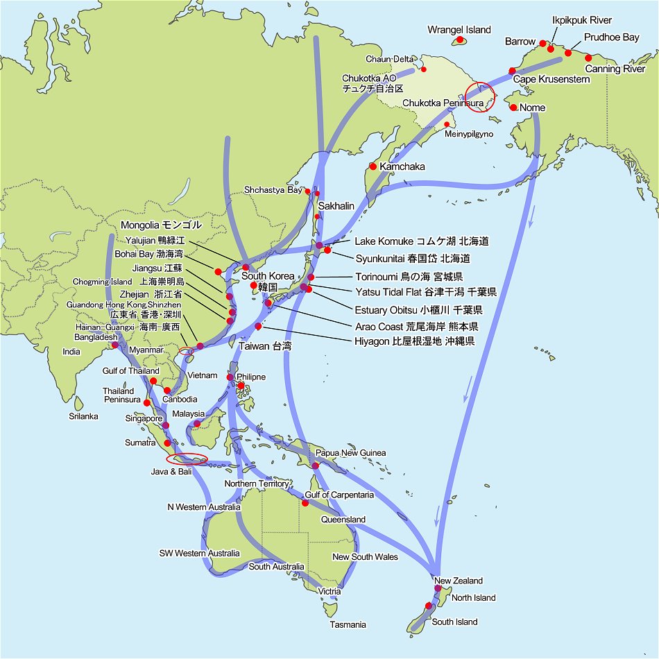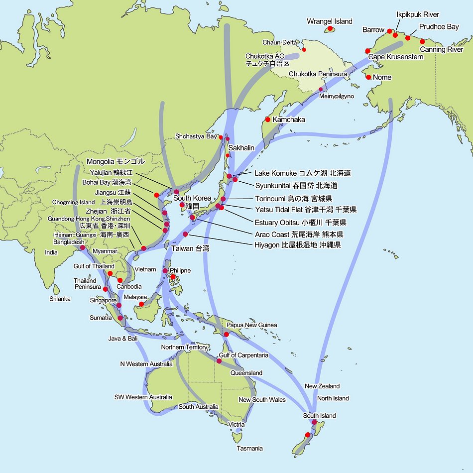 東アジア・オーストラリア地域のシギ・チドリの飛行ルートと標識地域 |