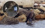 ●展望塔で紺色制服、背中に野鳥ガイドの文字。野鳥ガイドさんが活躍中。