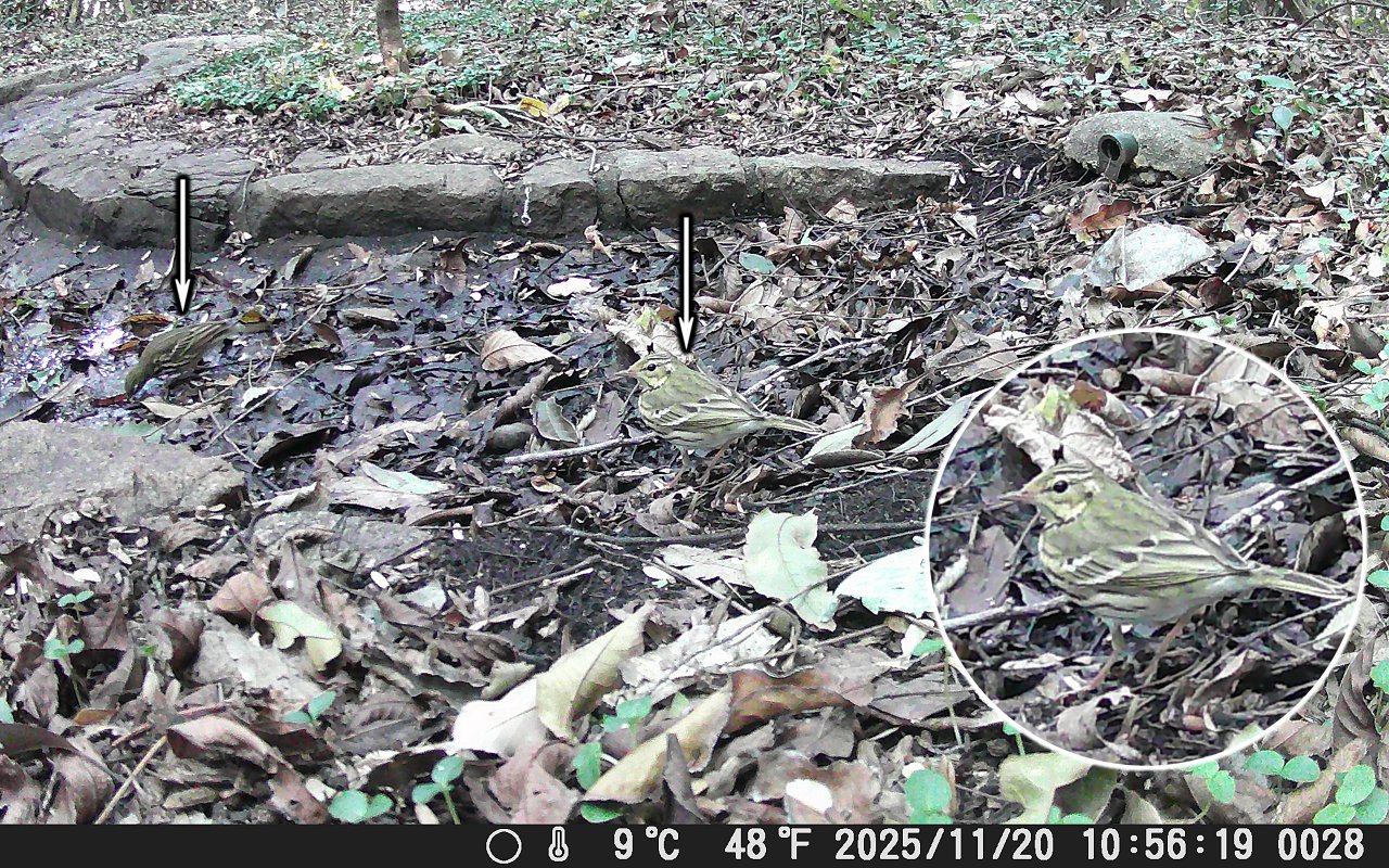 水場のトレイルカメラにビンズイが2羽。緑地のクロマツの林床等でも観察出来ることも。「ズィ~、」という地鳴きはわかりやすいです。