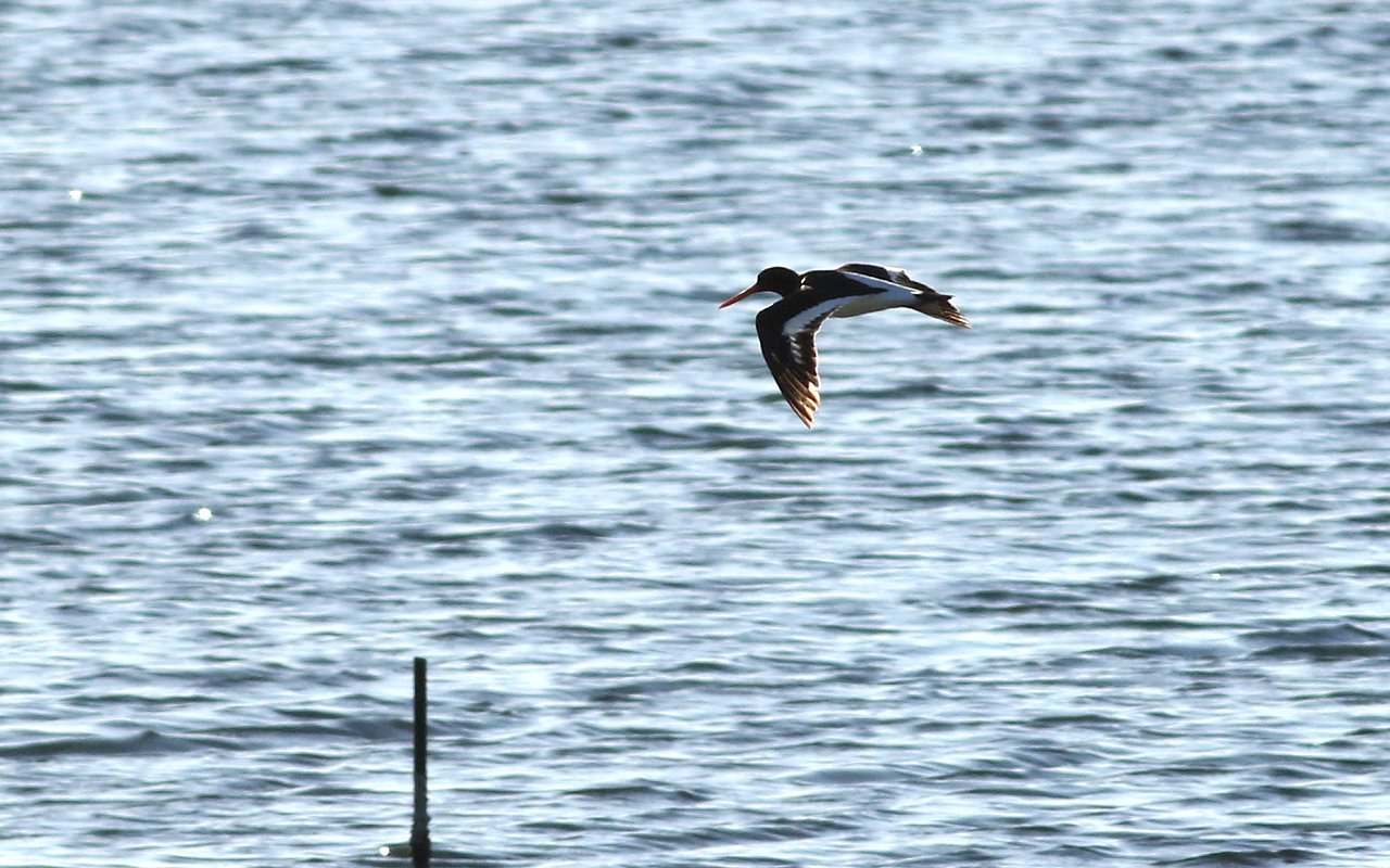 遠い逆光ですが、赤い嘴と白い背腰と下面、先端の黒い尾羽と次列から初列にかけての白い翼帯でミヤコドリ。お写真はY下氏です。多謝