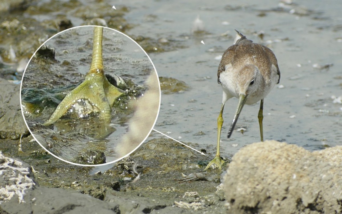 これまた、念のためお腹側からの画像を・・・。ふむっ、この子、右のT2が短いですね・・・って、そんな話じゃなかったですね。やっぱり、T3の外弁が白いですね。ってことで正解は外側尾羽の3.5枚が白い~って、勝手に決めました。他の個体、例えば成鳥なら、T3の内弁まで白いかもしれませんから、この場合「野鳥園で観察した、第一回冬羽個体を見ると、外側4枚目の外弁まで白い。」ってのが正確なところでしょう。バンダーさんなら知ってるかもね。