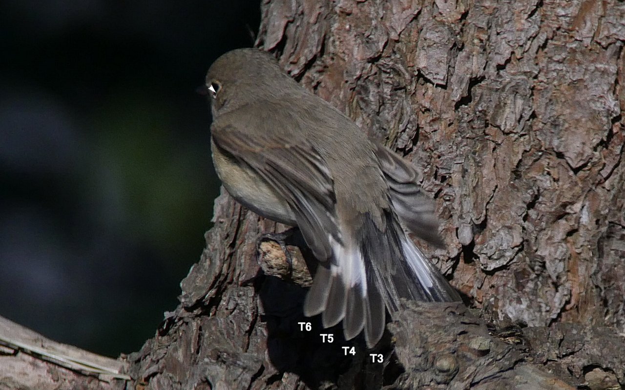 グダグダ文句垂れててもしょうがないので、画像で検証してみましょう。4K-PHOTOの動画で撮って、尾羽の画像を切り出しました。ん~っ、medaichiには外から4枚目・T3 (尾羽は内から外へT1.T2・・・と数える)の外弁(羽軸から見て体の外側、幅の狭い方)が白く見えます。