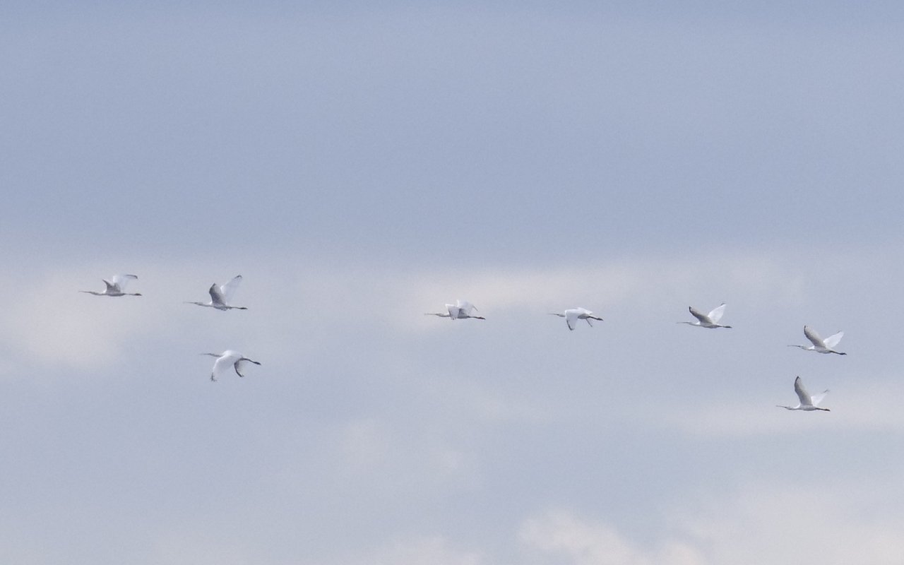 探したのですが、先月末に来た成鳥とちょっとだけ若い子はいませんでした。8羽全部幼鳥、って珍しいですね。なんとかカメラを替えてかろうじて遠い飛翔を1枚・・・。8羽とも翼の先っちょ初列風切に暗色部があるように見えます。とりあえず今季は10羽来ているようですが、成鳥が少ないですねえ。