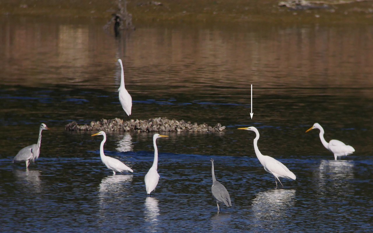 あれっ? こいつ大きくね?   今朝は渡りのチュウダイサギの群れかもというのが20羽+。この季節やとmedaichiは反射的にダイサギを探すことになります。いましたいました、まわりのアオサギやチュウダイサギより少し大きく見える子。