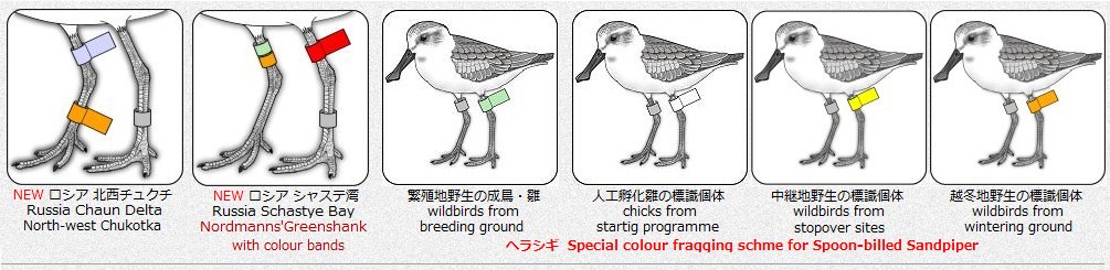 今回のupdateでは主にヘラシギに関する標識が追加されていた。ヘラシギの標識そのものは以前から装着はされていたのだが専用に標準化されたのかと思う。Marking Protocolそのものは国別/標識地別の色の組み合わせを列記したPDFなので、視覚的にというか直感的には把握しにくいというか慣れないとハードルが高いもんで、本サイトの方にはイラストで表示している。