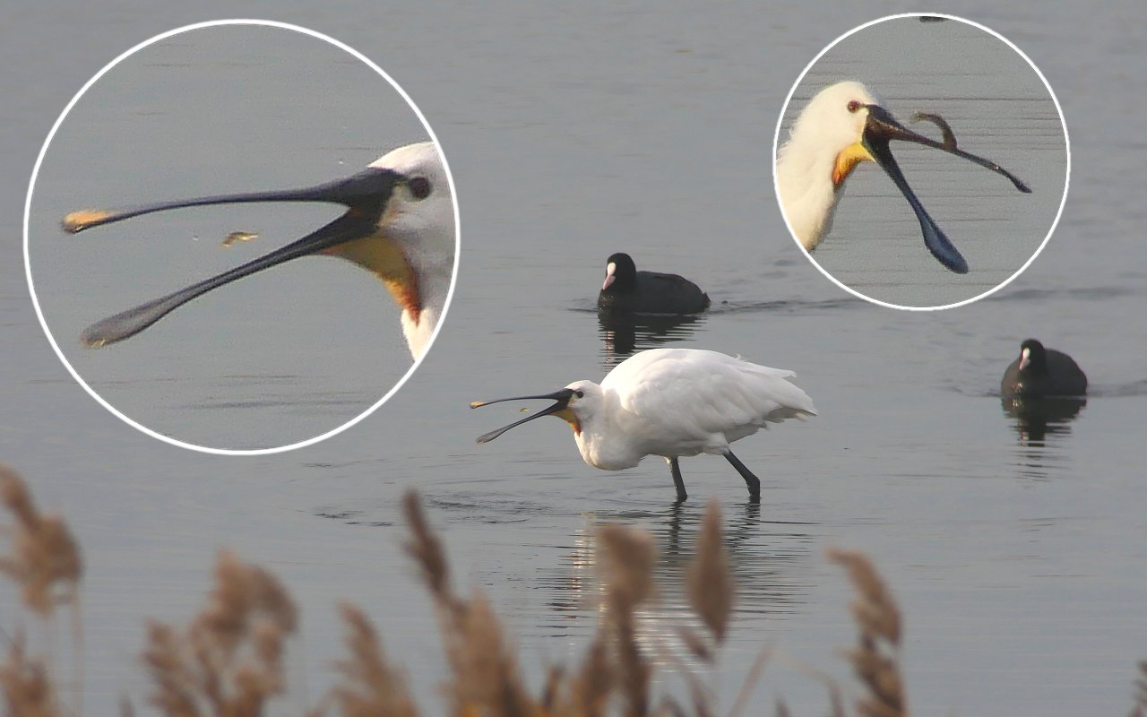12月に入って、ヘラサギは午前中に成鳥1羽と幼鳥2羽のグループが南池にいることが多くなってきた。採餌しているのが観察できる。